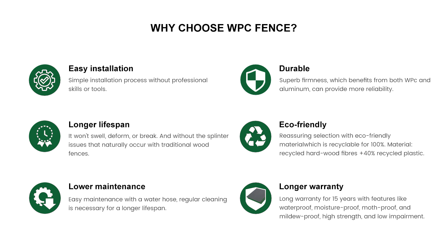 Sídli v meste Huzhou v provincii Zhejiang v Číne, je špecializovaný výrobca nových dekoratívnych materiálov, kompozitných terasových dosiek, kompozitného obkladu, kompozitného plotu a dlaždíc pre vonkajšie diy. Naše hlavné produkty sú kompozitné terasové dosky, kompozitný obklad, kompozitný plot a príslušenstvo. Ako Veľkoobchod Súprava plotových stĺpikov a panelov WPC. Naša továreň má viac ako 20 výrobných liniek a môže vám poskytnúť kvalitné produkty za nízku cenu. Zriadili sme prísny systém kontroly kvality podľa noriem ISO a CE, aby sme zabezpečili kvalitu našich strojov. Vývojový tím môže poskytnúť prispôsobené služby pre rôzne formy, aby vyhovel rôznym potrebám zákazníkov. Od predaja cez výrobu až po popredajnú podporu poskytujeme včasnú podporu a služby, aby sme splnili každú vašu potrebu. Kontrolou vývojových a výrobných procesov vám môžeme s istotou ponúknuť konkurencieschopné ceny. Súprava plotových stĺpikov a panelov WPC dodávatelia v Číne. Vitajte v našej továrni a dúfame, že s vami budeme spolupracovať v blízkej budúcnosti!